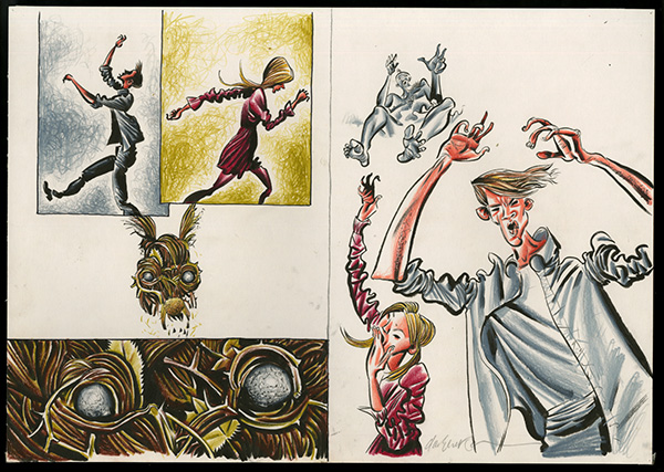 Ink and coloured pencil on paper.